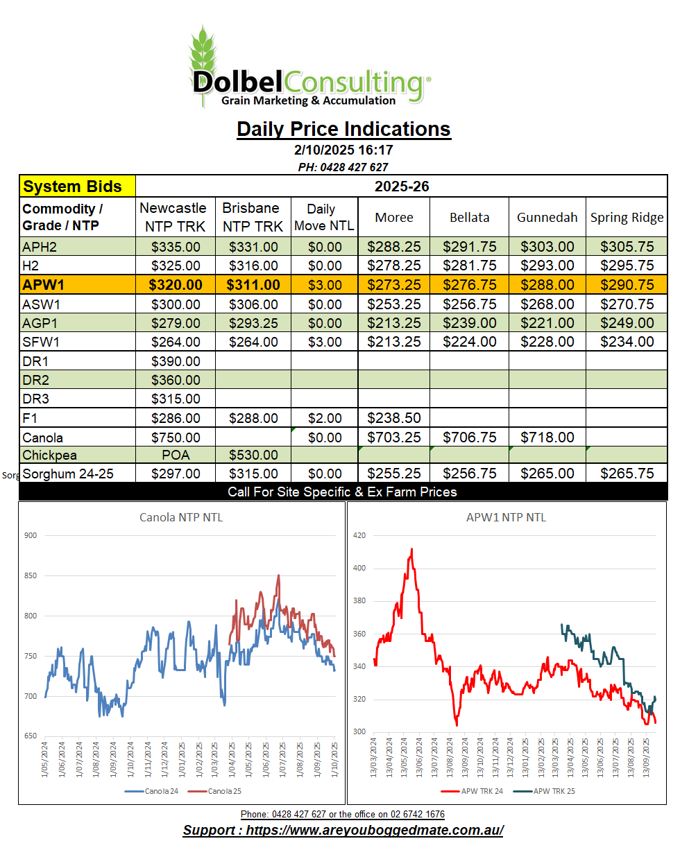The trade continue to actively seek old crop wheat for the local LPP consumer market. Yesterday saw SFW1 change hands at $300 SW LPP, indicating a delivered consumer price of about $325 delivered Killara / Caroona. Trade shorts are out there but Tangaratta continues to demand ASW or better. This only leaves the feed lots as the main SFW1 buyers when cleaning up silos.