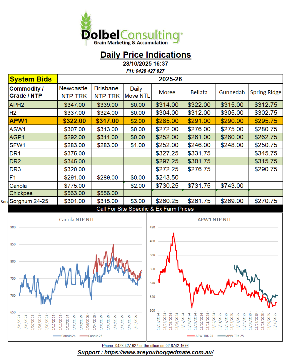 International grain markets were generally stronger, FOB values for US, Black Sea and EU wheat all improving. The thorn in our side when converting these changes and comparing today’s values to yesterdays values in AUD/t is of course the stronger dollar.