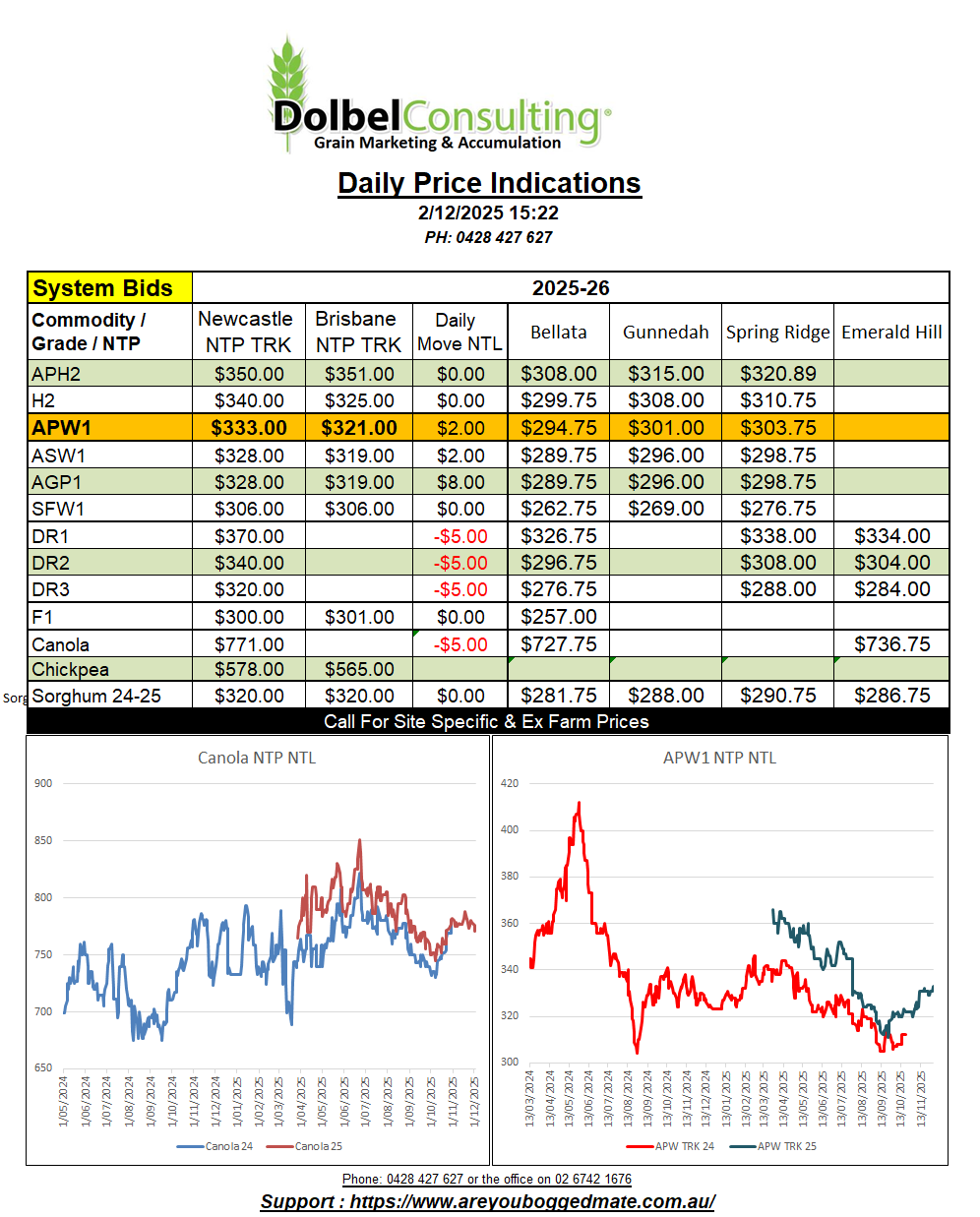 H2 grade was booked into the port at $360 and was also bid at $312 ex farm C-LPP for Dec / Jan pickup.