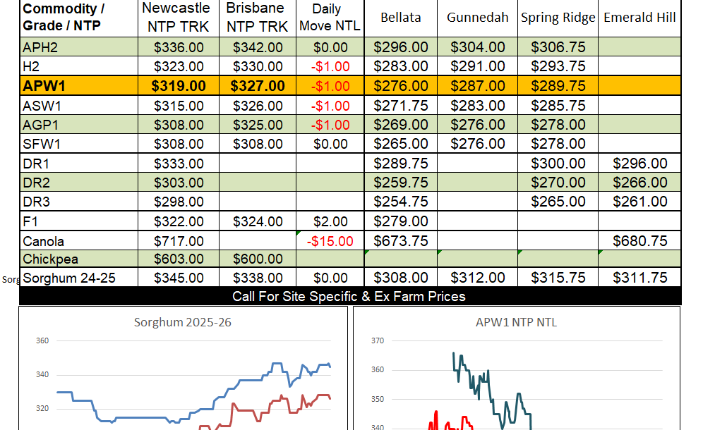 It’s pretty obvious the AUD is going to play a big roll in today’s trade pricing. It has increased, in USD / tonne terms, Aussie products around the world. Aussie milling wheat and sorghum will be the hardest to...